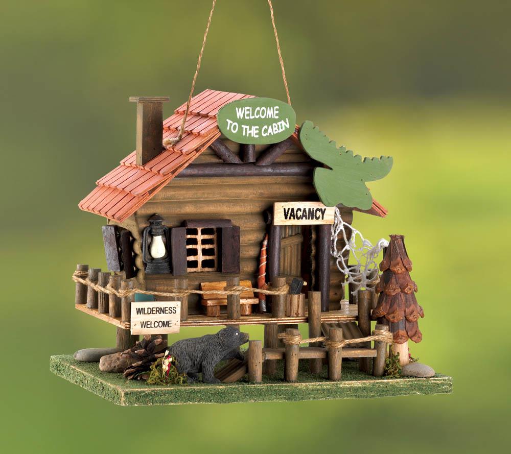 • Let the call of the wild welcome birds into your yard with this adorable log cabin birdhouse. Fashioned after a vacation rental in the heart of the wilderness, it features rustic accents, including a moose head sign, rope fencing, and a cute black bear cub on the prowl.
