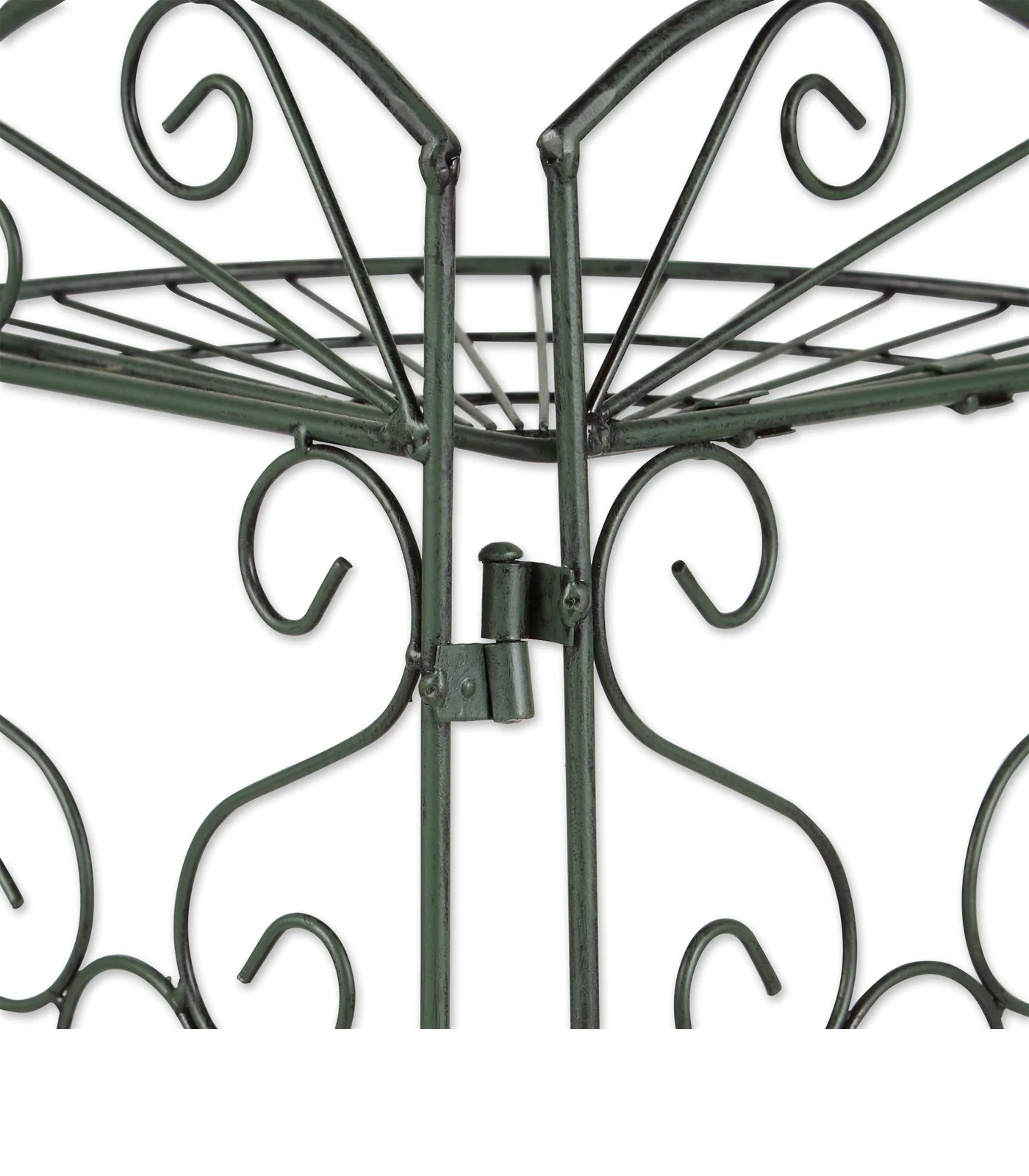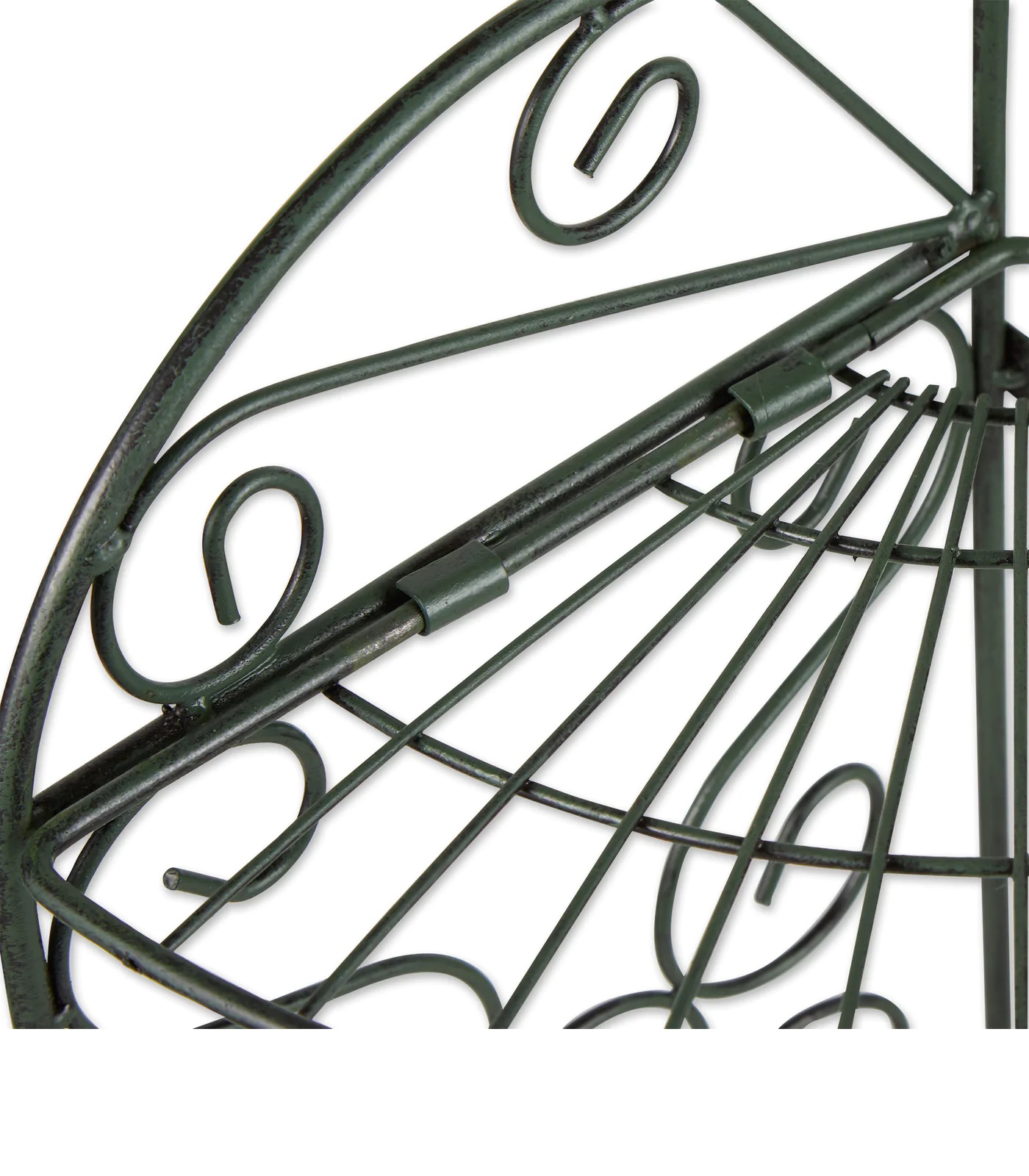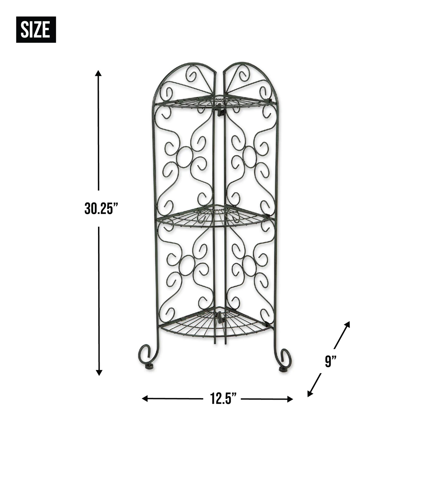 • Antiqued faux-verdigris plant stand is designed to fit into any corner; three shelves provide ample room for plants or display items.