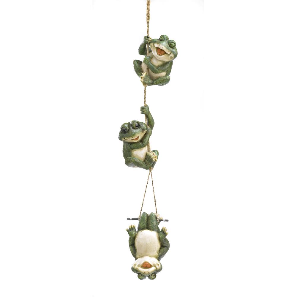 • A giggling trio of amphibious acrobats enjoys a merry moment of mirth, playfully tumbling down the length of a free-swinging rope. An utterly irresistible hanging sculpture that brings loads of love and laughter to your garden!