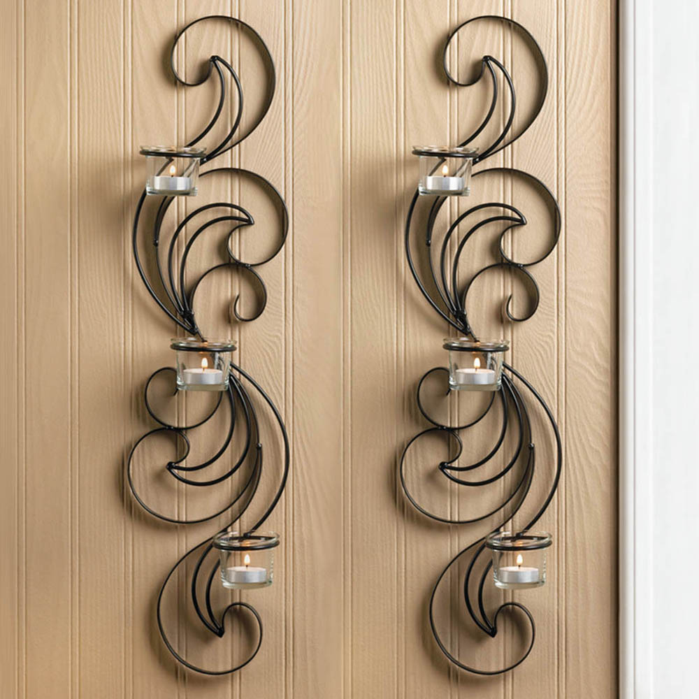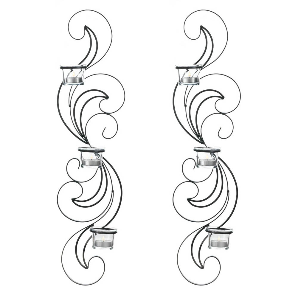 • Wisps of curling black iron billow up and out to create a magnificent set of statement wall sconces for your home.