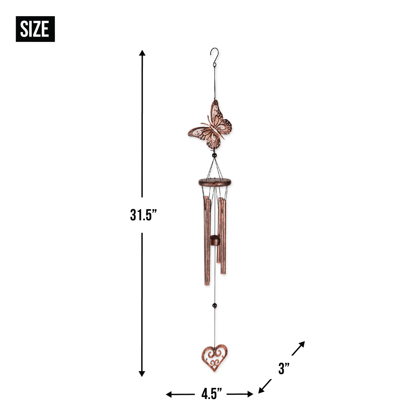 • This lovely wind chime will charm you, even when the breeze is still. It features a pretty butterfly on top and a decorative heart charm below. Hang it from your porch or patio and listen to the song of the wind!