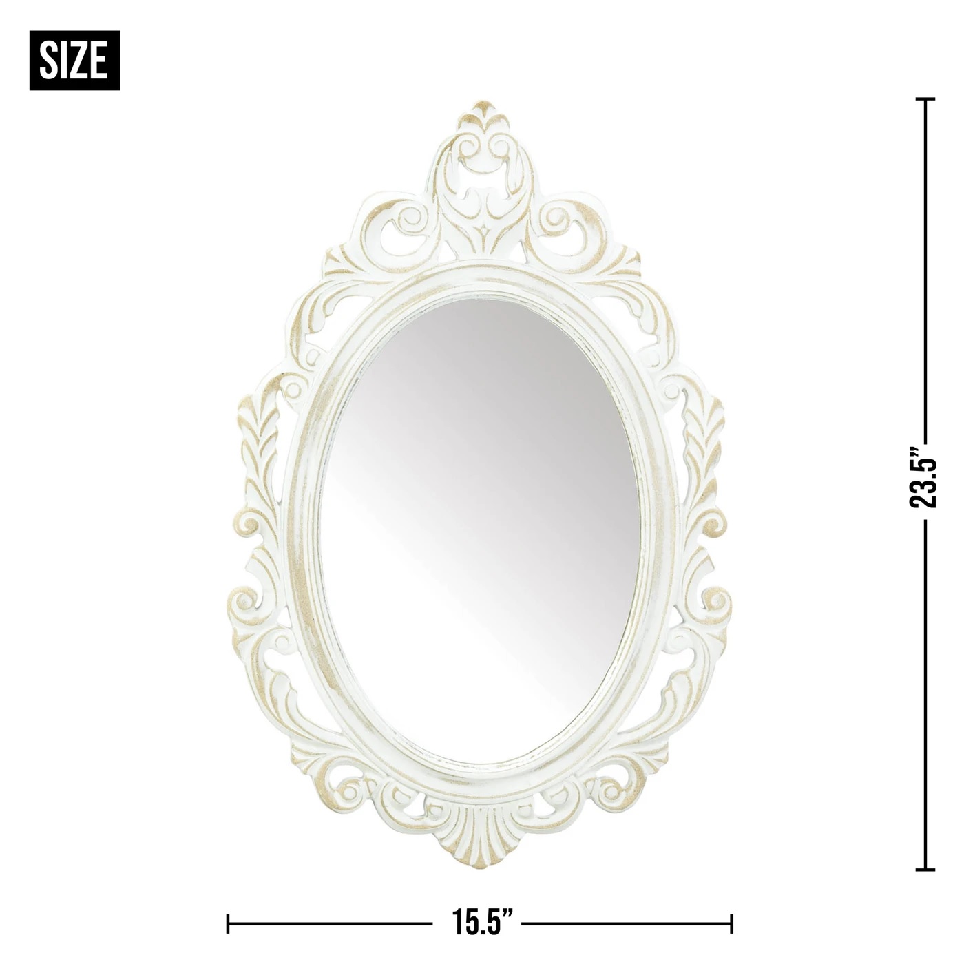 • Make your home look instantly more lavish with this decorative carved mirror. Featuring intricate wood detailing around the distressed frame for a vintage farmhouse look. Made from durable MDF wood, this vintage-inspired oval wall mirror is light yet durable and easy to hang. Mirrors are a great way to enhance a room's personality and fill empty wall space. Add a unique mirror to a guest bath for an easy and quick remodeled look or make your entryway feel larger with a reflective surface.