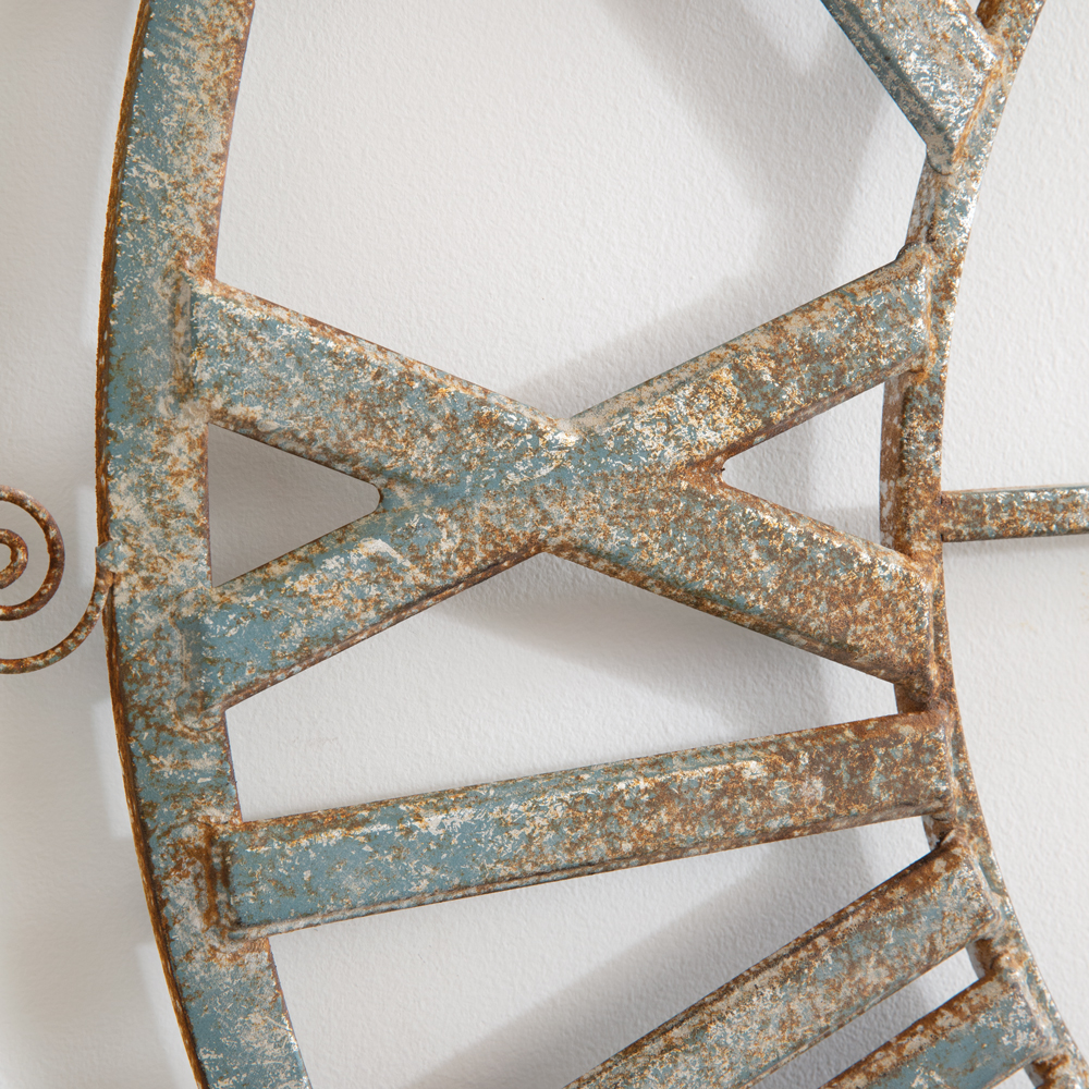 Introducing our Farmhouse Denim Selection - where timeless charm meets rustic elegance. The classic denim hues and gilded elements create a unique and dazzling piece. This clock features elegant Roman numerals and is crafted from metal. To hang, use its keyhole hanger.