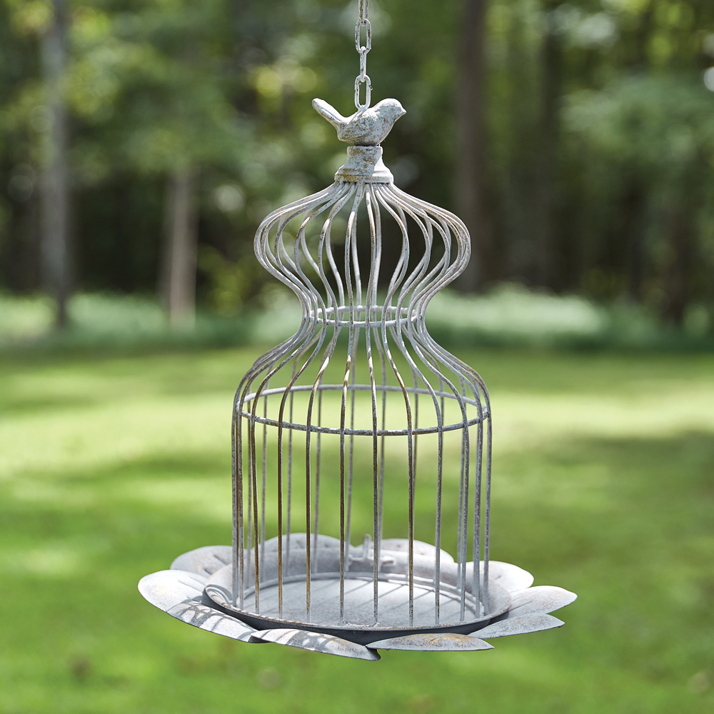 Our Birdcage Decor boasts a graceful, ornate design, reminiscent of classic Victorian-era craftsmanship. Place a candle or potted plant inside or use as a feeder. This item is crafted from metal and is 39''H with its hook and chain extended. The entire dome opens with a latch at the base.