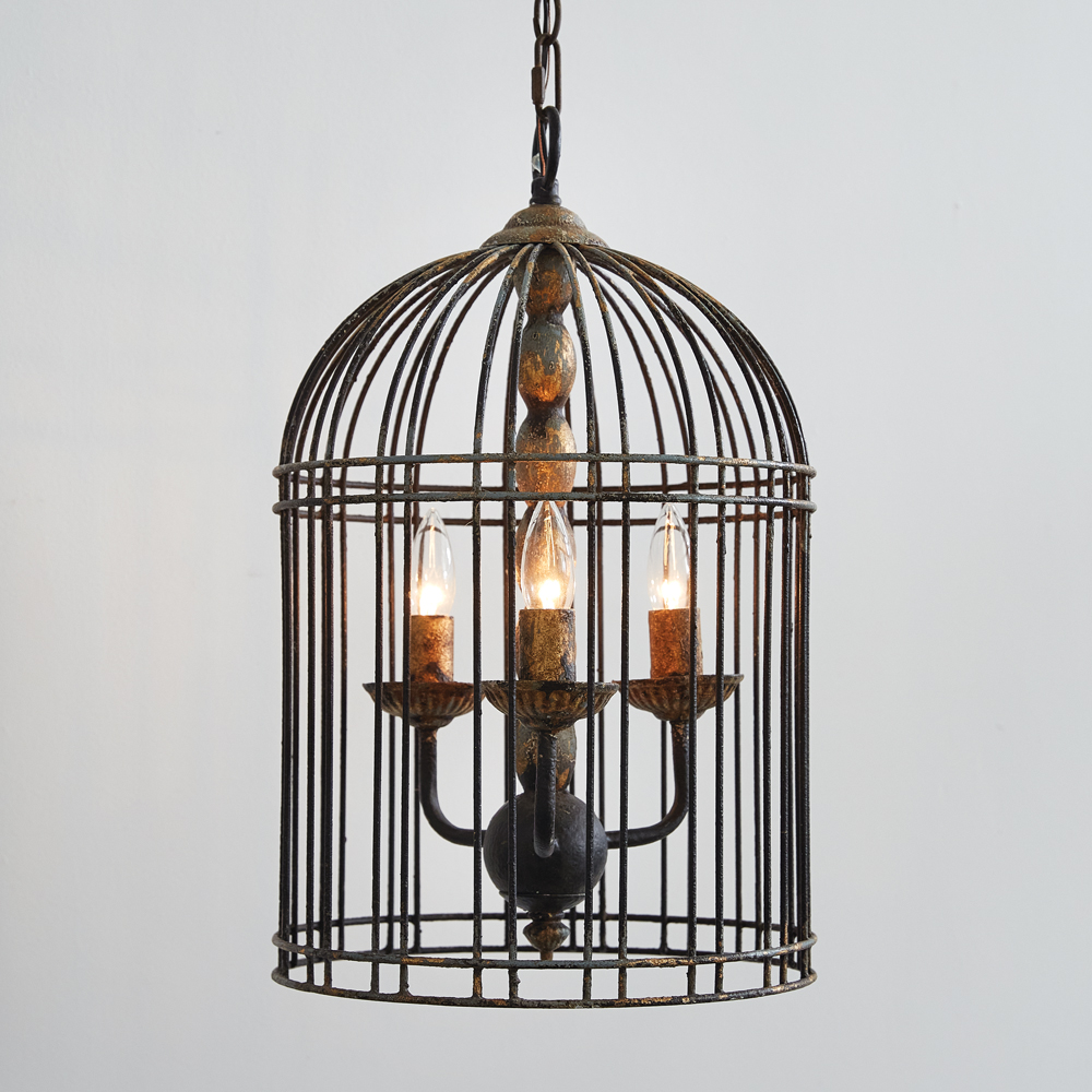 Meaning birdcage in French, our La Volière Pendant Lamp creates an aesthetic of the French countryside in a home. This pendant lamp is designed to be hardwired: no plug is included. This lamp hangs a total of 51½''H from the canopy to the end of the lamp. Includes a matching canopy and chain. Requires three candelabra base light bulbs, not included.