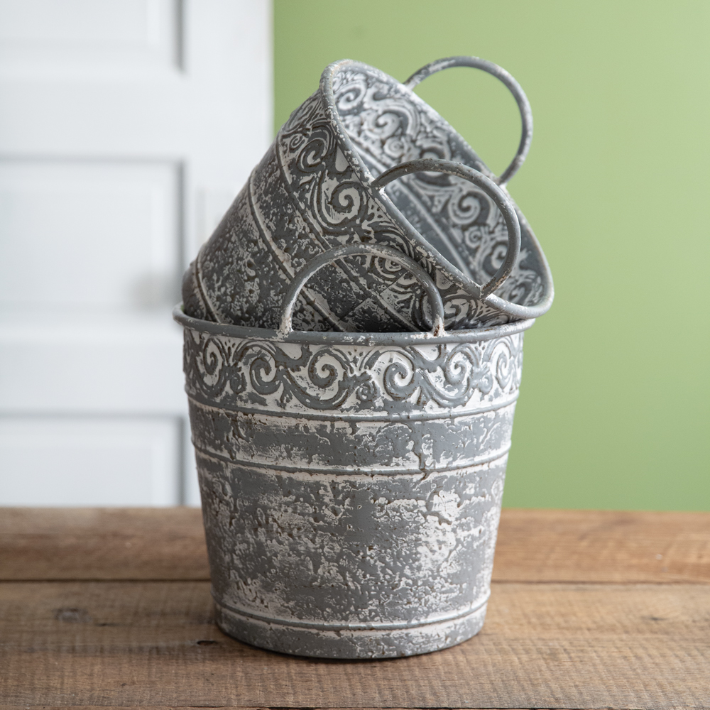 Crafted with intricate filigree detailing and finished in a distressed patina, these buckets exude timeless style. Whether used as decorative accents or functional storage solutions, these buckets are versatile and visually captivating. These buckets are fashioned from metal. The smallest bucket measures 9'' dia. x 9¾''H.