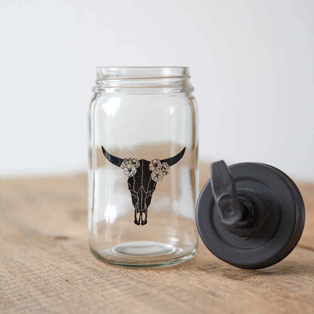 Western meets Boho with this soap dispenser. Holds one pint of liquid. Clear Glass. Features a black pumper.