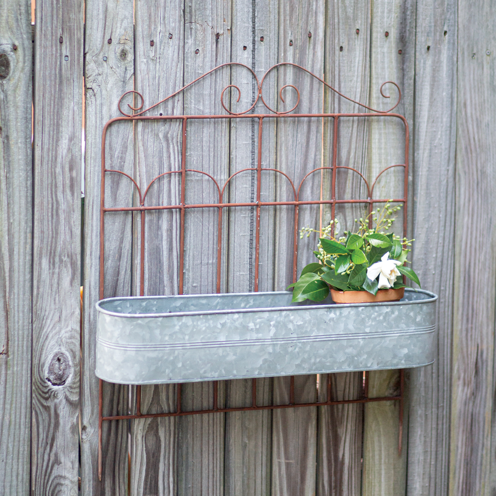 Display our fence planter among your garden for the ability to plant beautiful flowers. This piece is a wrought iron stake and resembles a garden fence. The planter is an oval galvanized bucket.